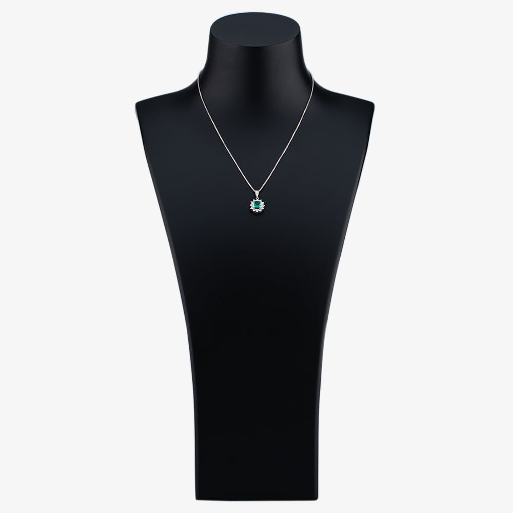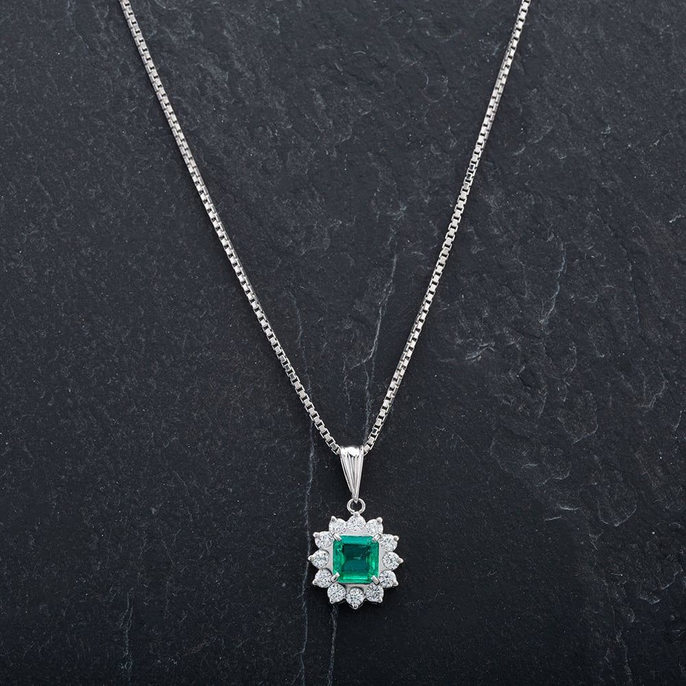 Platinum Square Cut Emerald Surrounded By Brilliant Cut Diamonds On 16" Adjustable Box Link Necklace Diamond Weight Approximate 0.50ct Emerald Approximate Weight 0.85ct