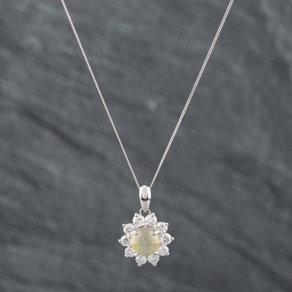 Second Hand Platinum Certificated 1.35ct Round Chrysoberyl Cats Eye & 0.60ct Brilliant Cut Diamond Cluster Pendant & 18 Inch Curb Chain 43141096 Second Hand Platinum Certificated 1.35ct Round Chrysoberyl Cats Eye & 0.60ct Brilliant Cut Diamond Cluster Pendant & 18 Inch Curb Chain 43141096