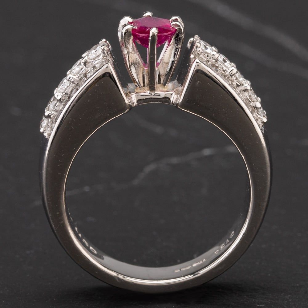 Platinum Oval Claw Set Ruby Measuring 7.5mm with Brilliant and Baguette Cut Diamond Set Shoulders