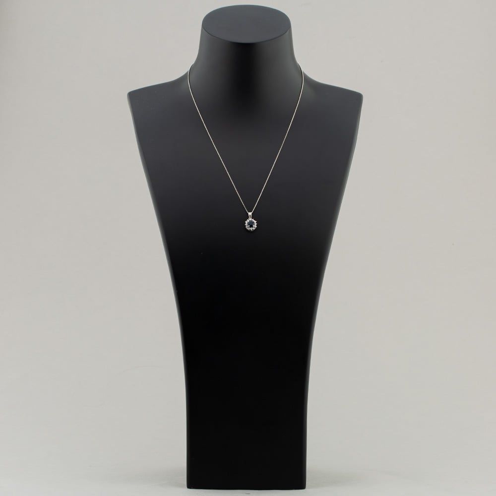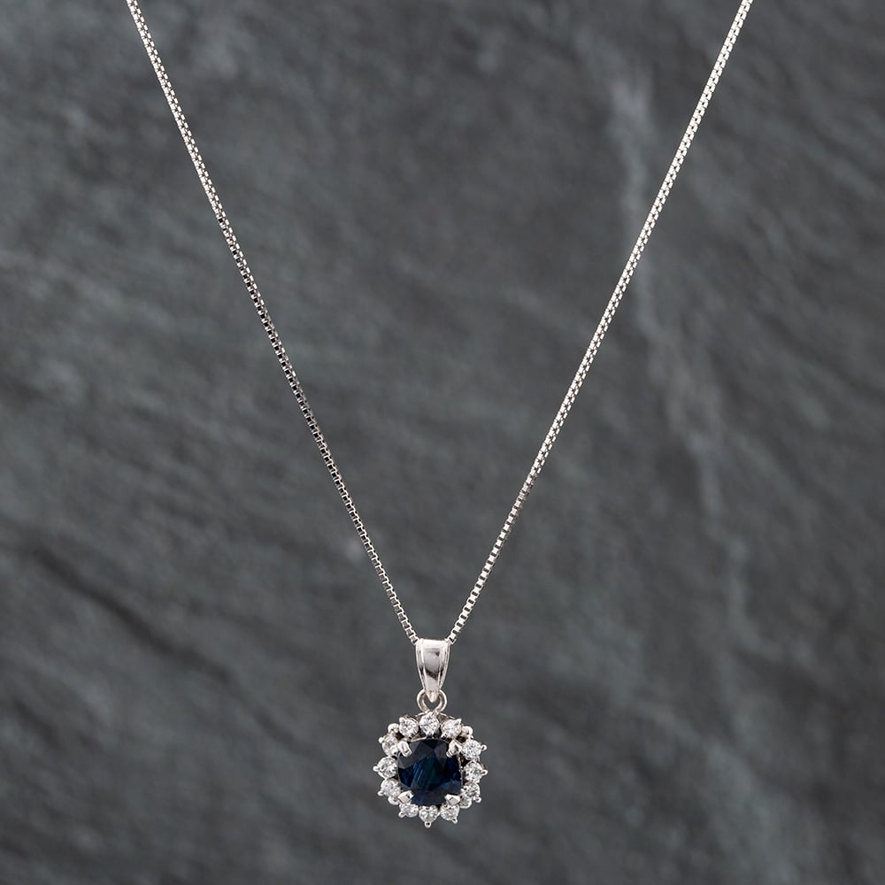 Platinum Sapphire & Brilliant Cut Diamond Cushion Shape Cluster Pendant & 18 Inch Box Chain