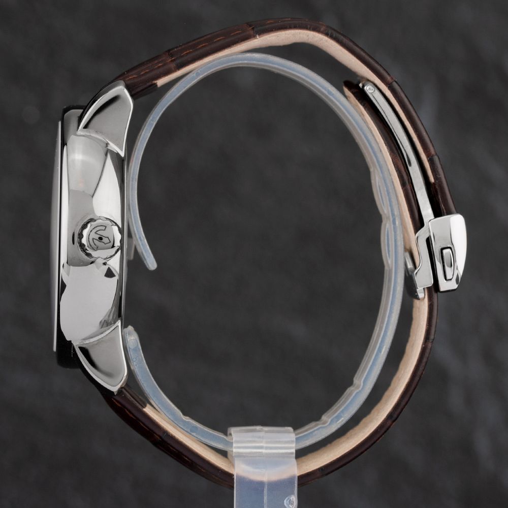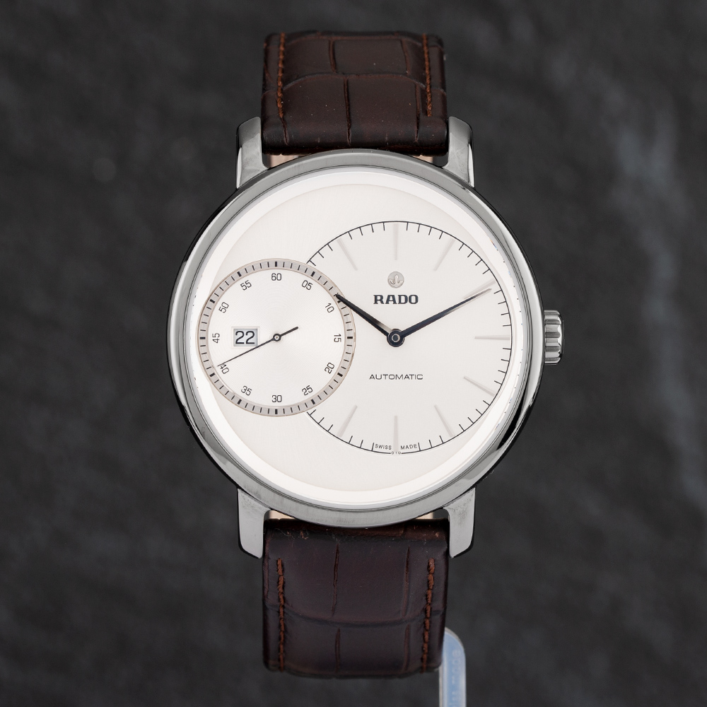 The Rado Diamaster Grande Seconde Plasma Ceramic Strap Watch is composed of a round shaped ceramic case and brown leather strap with a traditional buckle. It has a silver analogue dial , which is protected beneath scratch resistant sapphire crystal glass. Power is generated by the automatic movement. This model is also water resistant up to 100 metres.