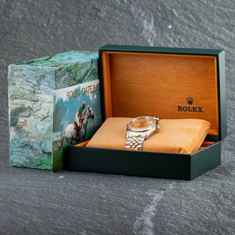 Batch 632 The Rolex Datejust Watch combines a round shaped stainless steel case and two colour stainless steel bracelet with a fold over clasp. The silver 36.0mm case measures 12.0mm thick and has a gold 18ct yellow gold fixed bezel with a screwed in case back and a lug width of 20mm. The champagne analogue dial is protected beneath scratch resistant sapphire crystal glass and has baton hour markers, as well as luminescent hands, and a date display. Power is generated by the chronometer certified automatic movement with a power reserve of up to 48 hours. The watch weighs 103.4 grams and has a water resistance of up to 100 metres.