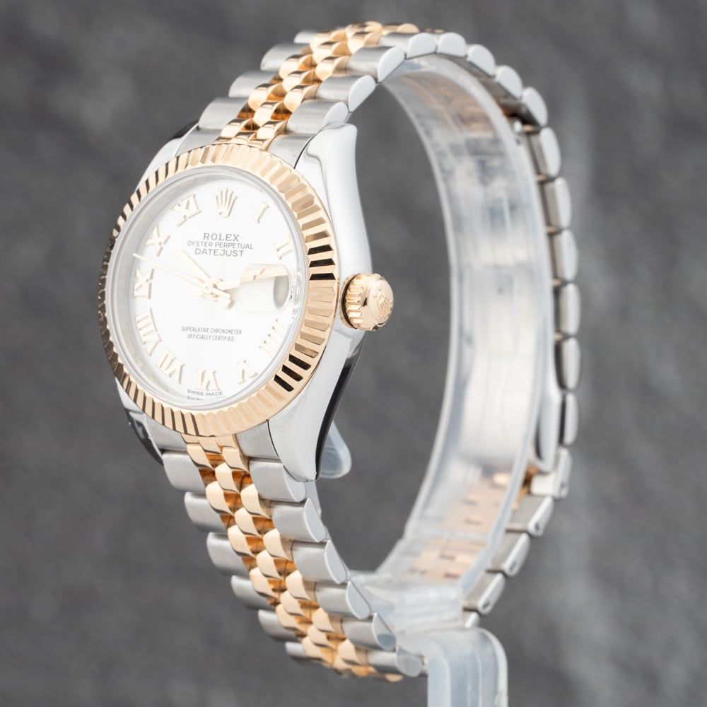 The Rolex Datejust Watch combines a round shaped stainless steel case and two colour stainless steel bracelet with a fold over clasp. The silver 28.0mm case measures 11.0mm thick and has a gold 18ct yellow gold fixed bezel with a screwed in case back and a lug width of 14mm. The silver analogue dial is protected beneath scratch resistant sapphire crystal glass and has roman numeral hour markers, as well as a date display. Power is generated by the chronometer certified automatic movement with a power reserve of up to 55 hours. The watch weighs 76.1 grams and has a water resistance of up to 100 metres.