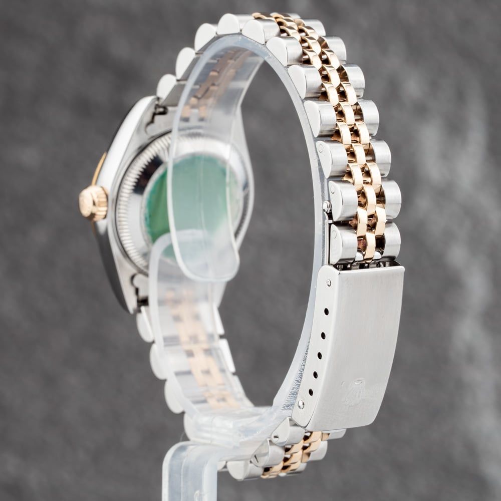 The Rolex Datejust Watch combines a round shaped stainless steel case and two colour stainless steel bracelet with a fold over clasp. The silver 26.0mm case measures 10.0mm thick and has a gold 18ct yellow gold fixed bezel with a screwed in case back and a lug width of 12mm. The champagne analogue dial is protected beneath scratch resistant sapphire crystal glass and has diamond hour markers, as well as a date display. Power is generated by the chronometer certified automatic movement with a power reserve of up to 48 hours. The watch weighs 56.4 grams and has a water resistance of up to 100 metres.