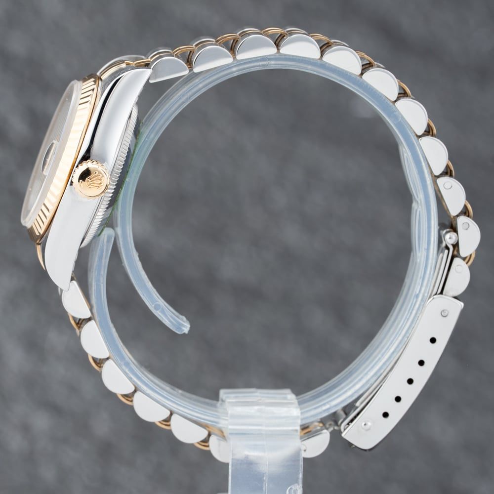 The Rolex Ladies Datejust Diamond Dot Jubilee Dial Watch combines a round shaped stainless steel case and two colour stainless steel bracelet with a fold over clasp. The silver 26.0mm case measures 10.0mm thick and has a gold 18ct yellow gold fixed bezel with a screwed in case back and a lug width of 12mm. The champagne analogue dial is protected beneath scratch resistant sapphire crystal glass and has diamond hour markers, as well as a date display. Power is generated by the chronometer certified automatic movement with a power reserve of up to 41 hours. The watch weighs 55.7 grams and has a water resistance of up to 100 metres.