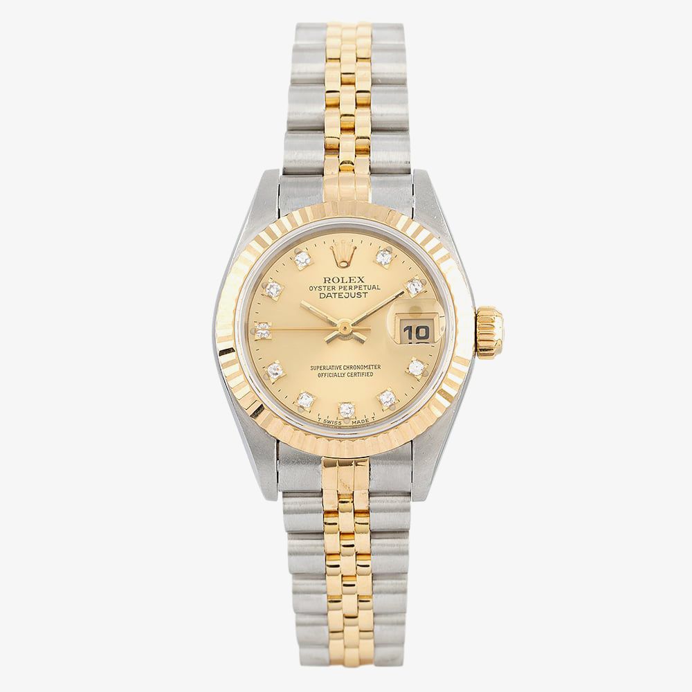https://www.thbaker.co.uk/second-hand-rolex-ladies-datejust-diamond-watch-69173-4809008106636Second Hand Rolex Ladies Datejust Diamond Watch 69173https://www.thbaker.co.uk/media/catalog/product/4/8/48-09-008_1_grey.jpg52505250GBPOutOfStockDATEJUST 2T BW GLD DIA DL This ladies Rolex watch is made from a Stainless Steel and Yellow Gold bracelet featuring a 26mm case and fluted bezel. Beneath the sapphire crystal glass is the gold dial, which has diamond set hour markers and a Cyclops lens date display. A chronometer certified automatic movement drives the watch.