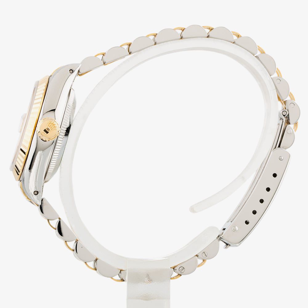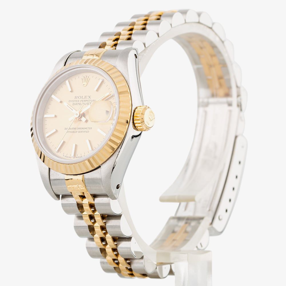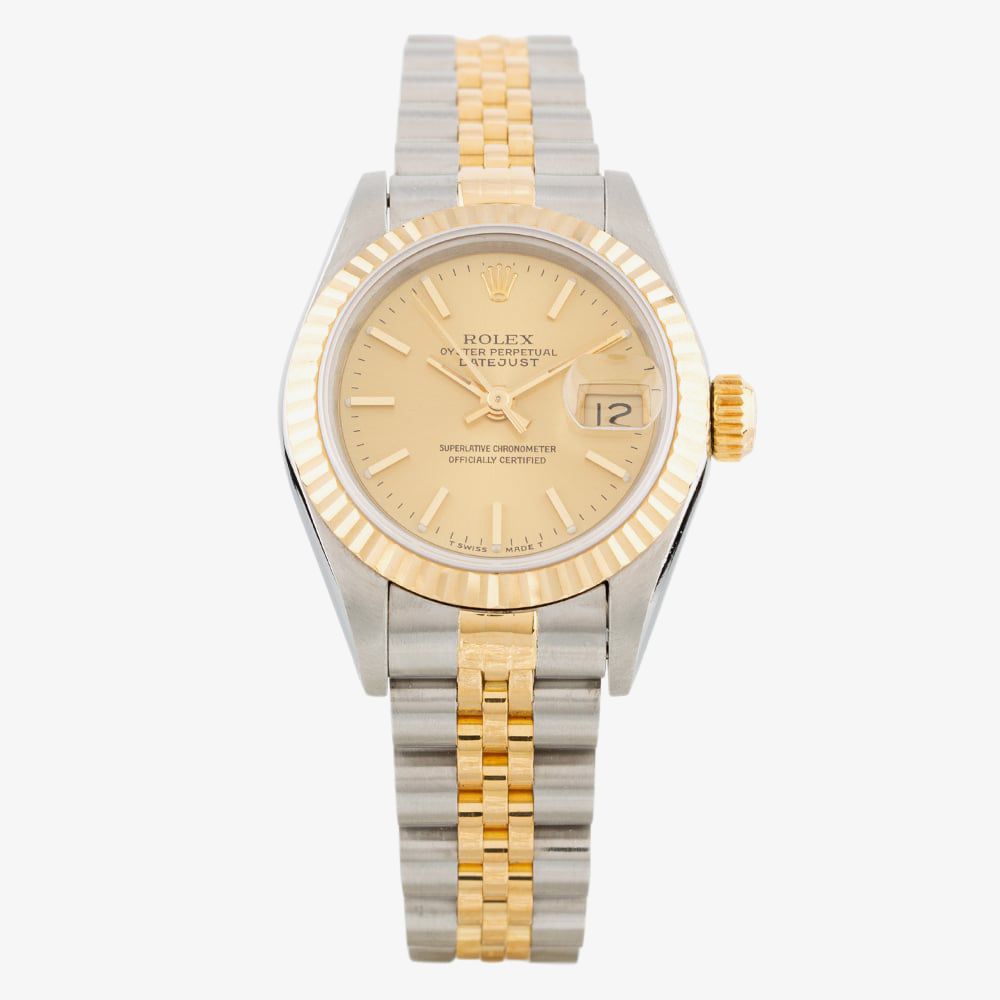 This ladies Rolex watch is made from a Stainless Steel and Yellow Gold bracelet featuring a 26mm case and fluted bezel. Beneath the sapphire crystal glass is the gold dial, which has slimline hands and baton hour markers and a Cyclops lens date display. a chronometer certified automatic movement drives the watch.