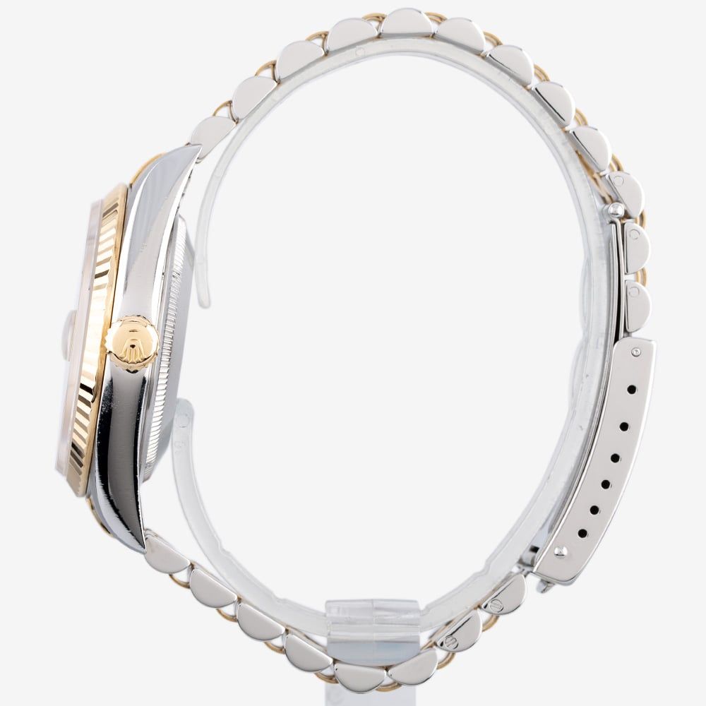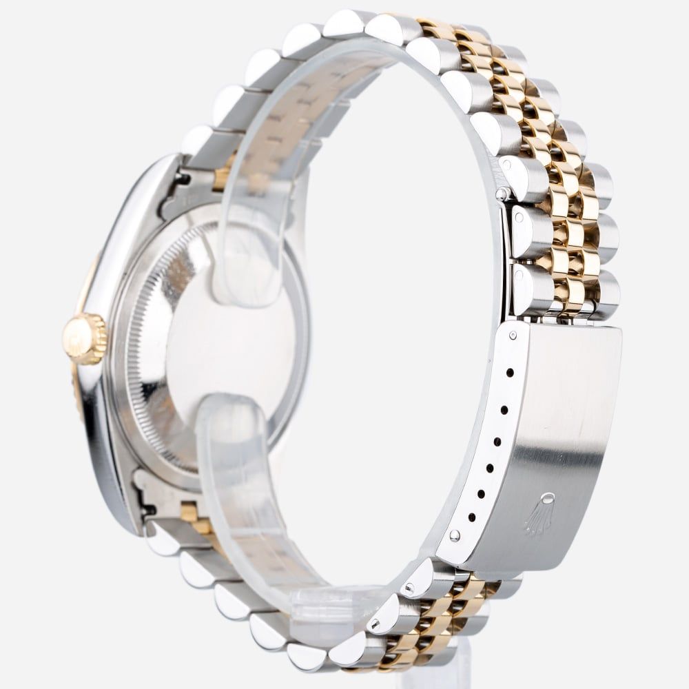 This Rolex watch is made from a Stainless Steel and Yellow Gold bracelet featuring a 36mm case and fluted bezel. Beneath the sapphire crystal glass is the gold dial, which has bold hands and diamond set hour markers with a Cyclops lens date display. Powered by a chronometer certified automatic movement which drives the watch.