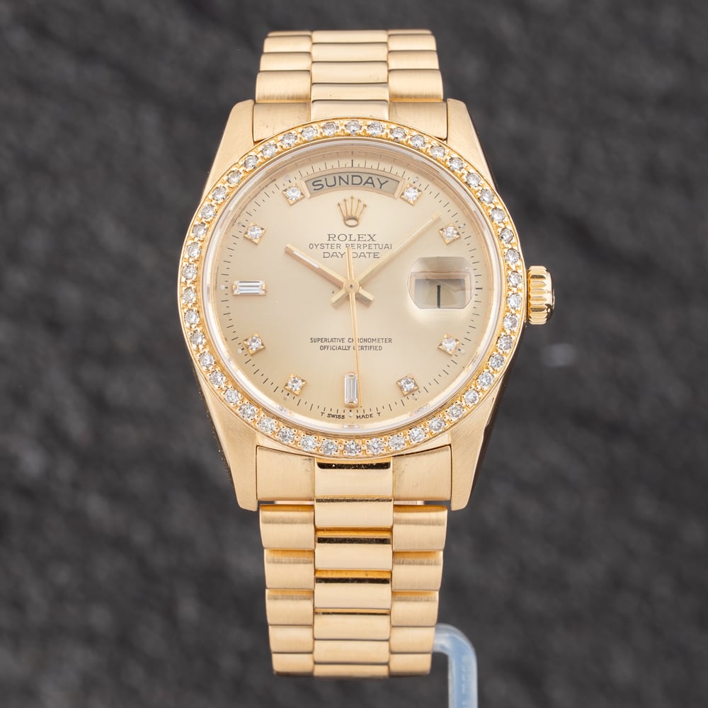 <a href="https://www.thbaker.co.uk/stores/"><b>Click here to find your <font color="6d1a42">nearest store</font></b></a>Second Hand Rolexhttps://www.thbaker.co.uk/media/catalog/product/4/4/44-01-1064_2.jpghttps://www.thbaker.co.uk/media/catalog/product/4/4/44-01-1064_3.jpghttps://www.thbaker.co.uk/media/catalog/product/4/4/44-01-1064_4.jpghttps://www.thbaker.co.uk/media/catalog/product/4/4/44-01-1064_5.jpgadd-to-cartcondition:Yesdisc_no_stock:Noex_display:Nosearch_keywords:Luxury, WaterproofYesNoNoLuxury, Waterproof44011064Second Hand Rolex18038MensOfficial Rolex Packaging12 Month WarrantyLuxuryNoWatchGoldGoldGold Bracelet18ct GoldRound12.0mm36.0mmAnalogueSapphire Crystal GlassChampagneChampagne100 metresAutomaticFold Over ClaspDiamond127.2gNoNoNoYesYesYesNo{"name":"v12_finance","text":"Or from \u00a3256 per month","imageUrl":"https:\/\/www.thbaker.co.uk\/media\/nosto\/v12-finance.png"}Second Hand Rolex Mens Day-Date 18ct Gold Bracelet Watch44-01-10642025-12-17 00:00:0002026-03-17