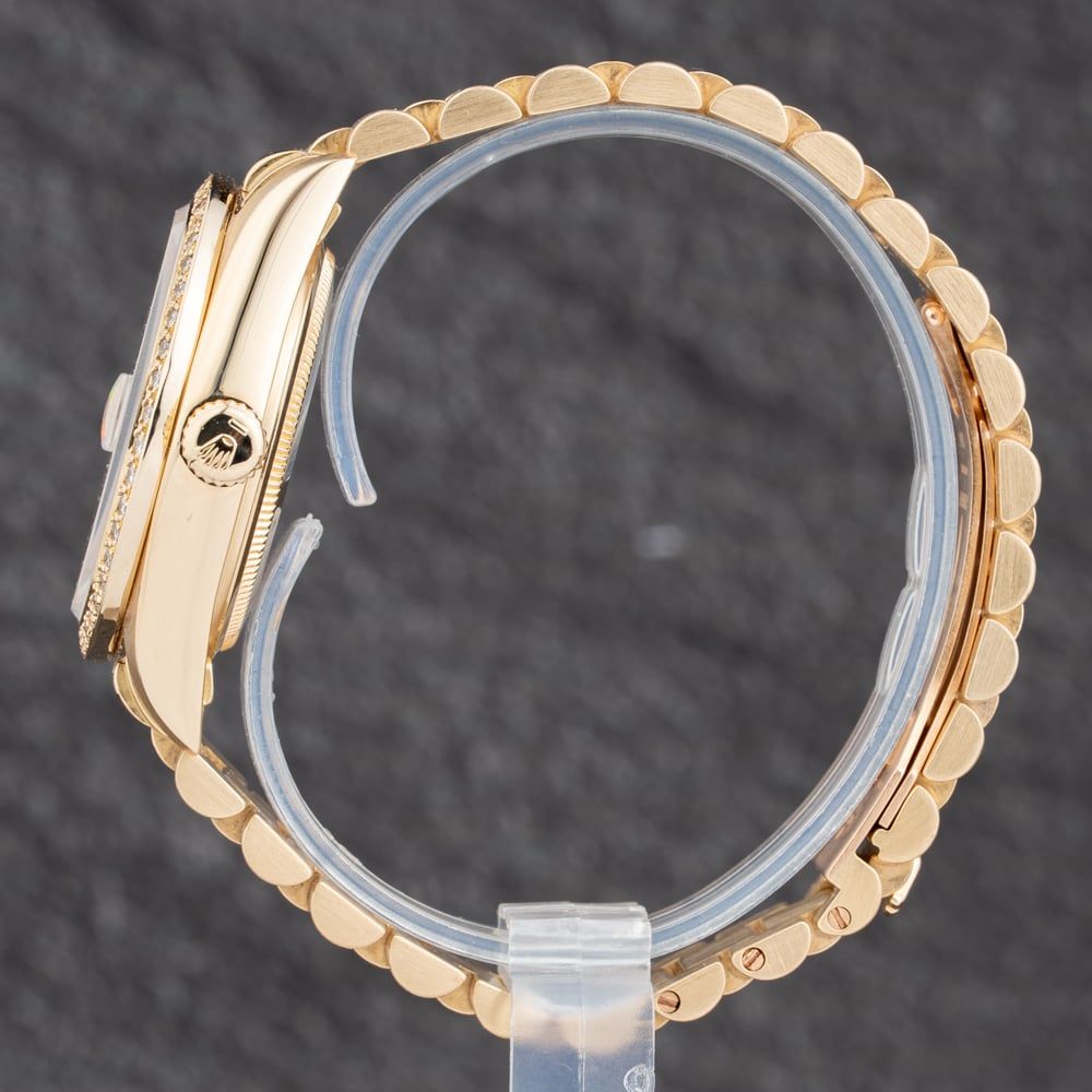 Batch 1280 The Rolex Mens Day-Date 18ct Gold Bracelet Watch combines a round shaped 18ct gold case and gold bracelet with a fold over clasp. The gold 36.0mm case measures 12.0mm thick and has a gold 18ct yellow gold fixed bezel with a screwed in case back and a lug width of 20mm. The champagne analogue dial is protected beneath scratch resistant sapphire crystal glass and has diamond hour markers, as well as luminescent hands, and a date display. Power is generated by the chronometer certified automatic movement. The watch is set with diamonds and weighs 127.2 grams. This model also has a water resistance of up to 100 metres.