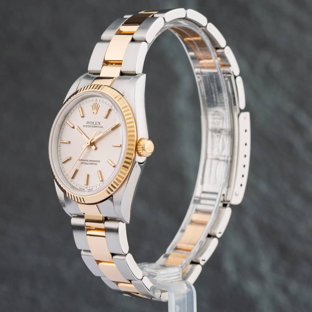 Batch 459 The Rolex Oyster Perpetual Watch is composed of a 34.0mm round shaped stainless steel case and two colour stainless steel bracelet with a fold over clasp. It has a silver analogue dial with luminescent dial hands, which is protected beneath scratch resistant sapphire crystal glass. Power is generated by the chronometer certified automatic movement. This model is also water resistant up to 100 metres.