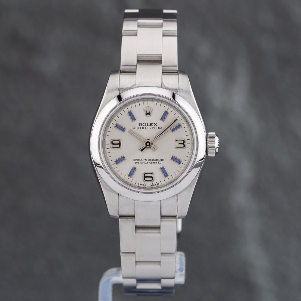 Batch 822 The Rolex Oyster Perpetual Watch combines a round shaped stainless steel case and silver stainless steel bracelet with a fold over clasp. The silver 26.0mm case measures 10.0mm thick and has a silver stainless steel fixed bezel with a screwed in case back and a lug width of 12mm. The silver analogue dial is protected beneath scratch resistant sapphire crystal glass and has arabic numerals & batons hour markers. Power is generated by the chronometer certified automatic movement with a power reserve of up to 48 hours. The watch weighs 70.3 grams and has a water resistance of up to 100 metres.