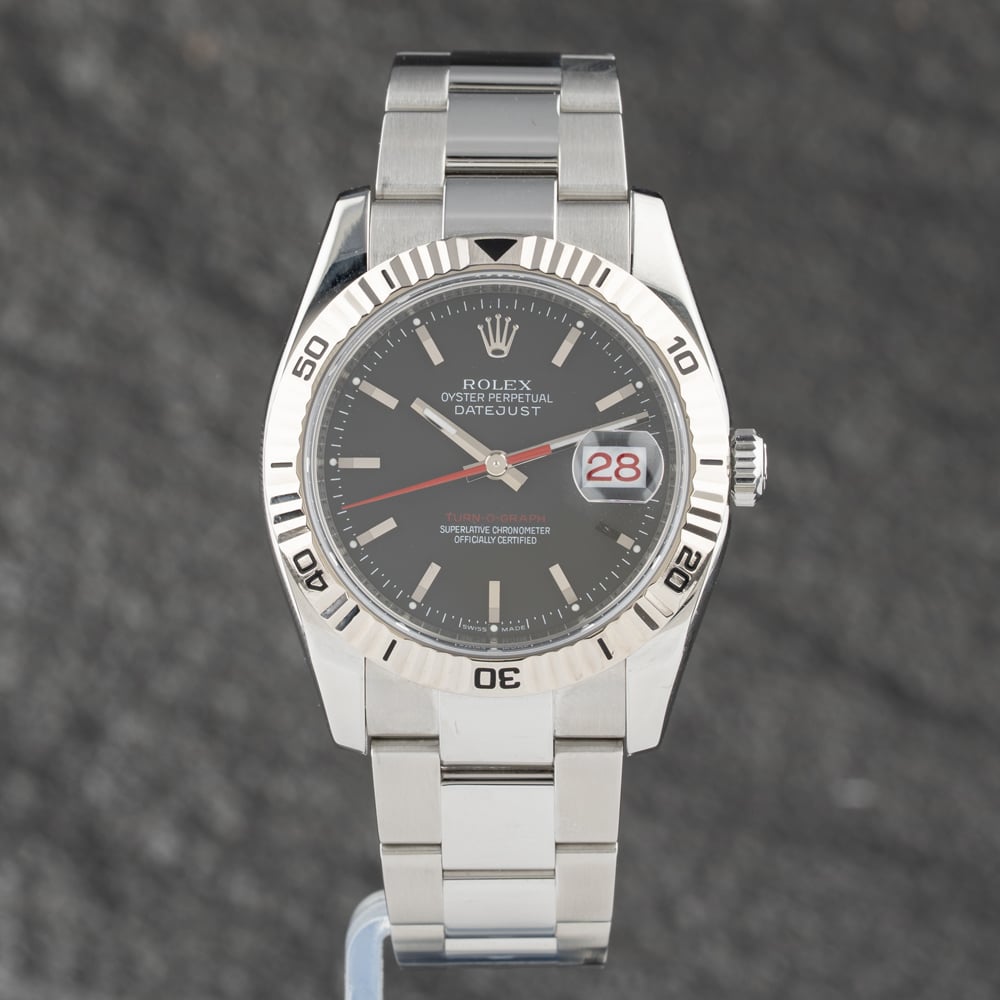 The Rolex Turn O Graph Watch combines a round shaped stainless steel case and silver stainless steel bracelet with a fold over clasp. The silver 36.0mm case measures 12.0mm thick and has a silver stainless steel bi-directional rotating bezel with a screwed in case back and a lug width of 20mm. The black analogue dial is protected beneath scratch resistant sapphire crystal glass and has baton hour markers, as well as a date display. Power is generated by the chronometer certified automatic movement with a power reserve of up to 42 hours. The watch weighs 124.1 grams and has a water resistance of up to 100 metres.