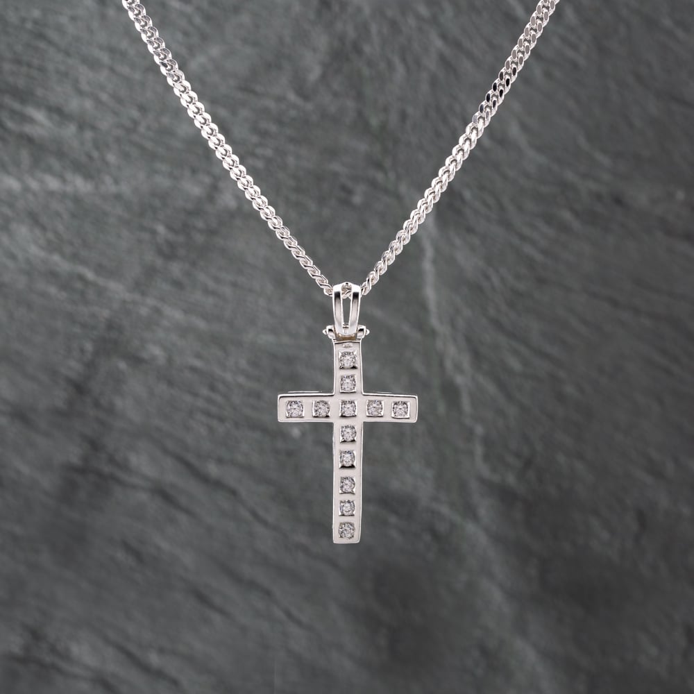 Silver Cubic Zirconia Rubover Set Cross Pendant & 20 Inch Curb Chain