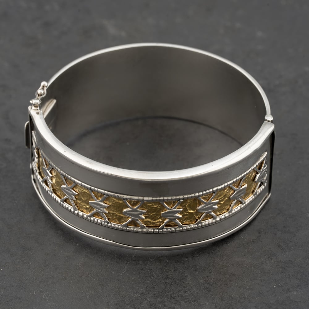 Silver With Gold Textured Panel Wide Standard Hinged Bangle
