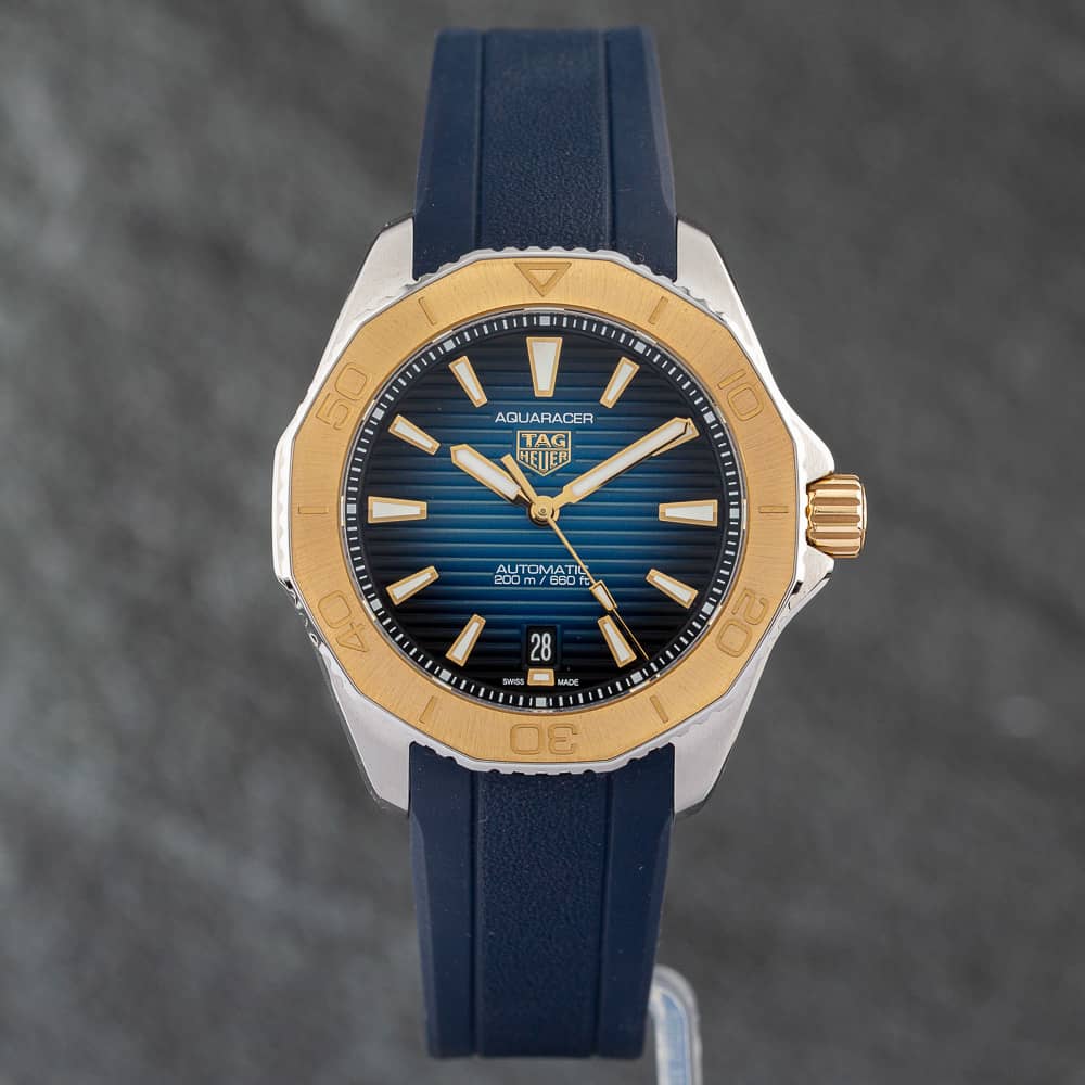 The TAG Heuer Aquaracer Professional Watch is composed of a 40.0mm round shaped stainless steel case and blue rubber strap with a push button deployment clasp. It has a blue analogue dial with a date display, luminescent dial hands, which is protected beneath scratch resistant sapphire crystal glass. Power is generated by the automatic movement. This model is also water resistant up to 200 metres.
