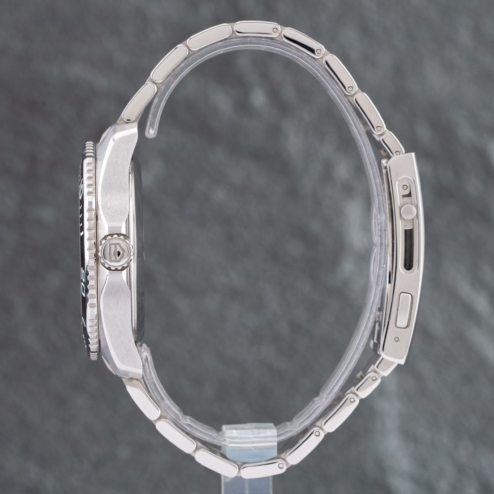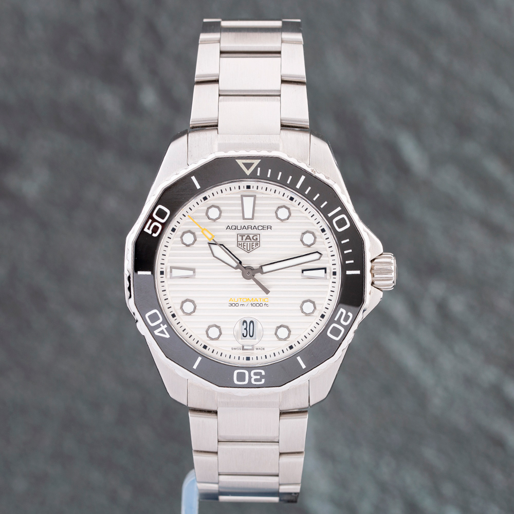 The TAG Heuer Aquaracer Watch combines a round shaped stainless steel case and silver stainless steel bracelet with a push button deployment clasp. The silver 43.0mm case measures 12.0mm thick and has a black stainless steel uni-directional rotating bezel with a snap off case back and a lug width of 20mm. The silver analogue dial is protected beneath scratch resistant sapphire crystal glass and has dot & baton hour markers, as well as a date display. Power is generated by the automatic movement. The watch weighs 186 grams and has a water resistance of up to 300 metres.
