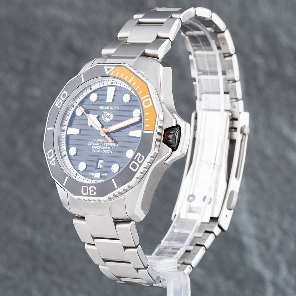 The TAG Heuer Aquaracer Watch combines a round shaped stainless steel case and silver stainless steel bracelet with a push button deployment clasp. The silver 45.0mm case measures 15.0mm thick and has a multi-coloured stainless steel uni-directional rotating bezel with a snap off case back and a lug width of 22mm. The black analogue dial is protected beneath scratch resistant sapphire crystal glass and has dot & baton hour markers, as well as luminescent hands, and a date display. Power is generated by the chronometer certified automatic movement with a power reserve of up to 70 hours. The watch weighs 189.1 grams and has a water resistance of up to 1000 metres.