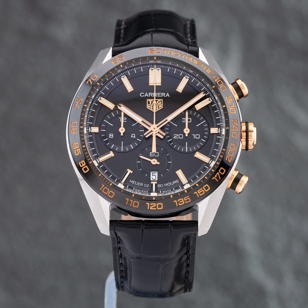 The TAG Heuer Carrera Chronograph Watch combines a round shaped stainless steel case and black leather strap with a push button deployment clasp. The silver 44.0mm case measures 14.0mm thick and has a black ceramic fixed bezel with a sapphire crystal case back and a lug width of 20mm. The black analogue dial is protected beneath scratch resistant sapphire crystal glass and has baton hour markers, as well as luminescent hands, a date display, and chronograph function. Power is generated by the automatic movement with a power reserve of up to 80 hours. Other features on this watch include a tachymeter scale a tachymeter scale. The watch weighs 123.6 grams and has a water resistance of up to 100 metres.