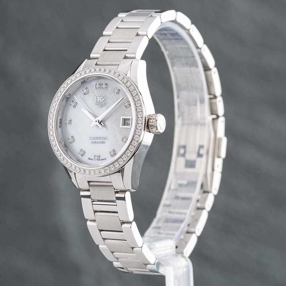 The TAG Heuer Carrera Diamond Bezel Watch is composed of a 29mm round shaped stainless steel case and silver stainless steel bracelet with a push button deployment clasp. It has a mother of pearl analogue dial with a date display, which is protected beneath scratch resistant sapphire crystal glass. Power is generated by the automatic movement. This model is also water resistant up to 100 metres.