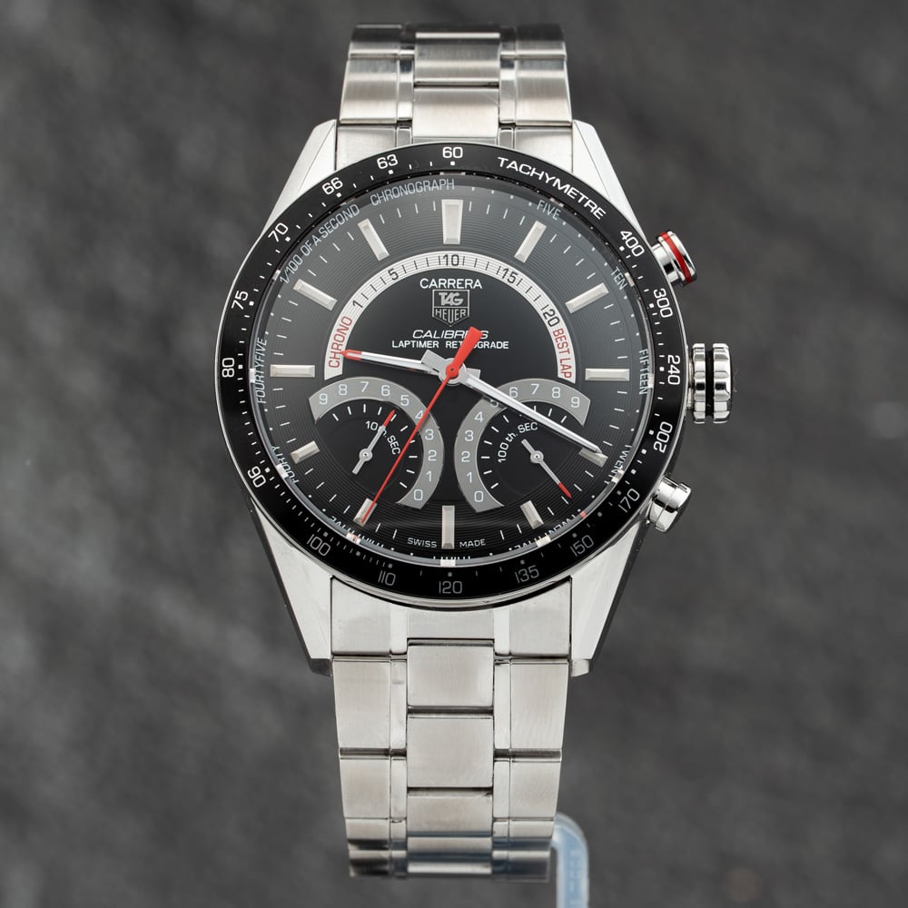 The TAG Heuer Carrera Watch combines a round shaped stainless steel case and silver stainless steel bracelet with a push button deployment clasp. The silver 43.0mm case measures 13.0mm thick and has a black stainless steel fixed bezel with a screwed in case back and a lug width of 22mm. The black analogue dial is protected beneath scratch resistant sapphire crystal glass and has baton hour markers, as well as chronograph function. Power is generated by the automatic movement. The watch weighs 177.1 grams and has a water resistance of up to 100 metres.