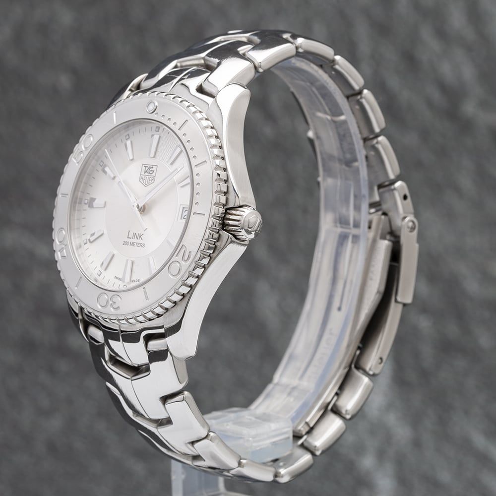 Batch 795 The TAG Heuer Link Watch combines a round shaped stainless steel case and silver stainless steel bracelet with a fold over clasp. The silver 38.0mm case measures 10.0mm thick and has a silver stainless steel uni-directional rotating bezel with a screwed in case back. The silver analogue dial is protected beneath scratch resistant sapphire crystal glass and has baton hour markers, as well as luminescent hands, and a date display. Power is generated by the quartz movement. The watch weighs 132.5 grams and has a water resistance of up to 200 metres.