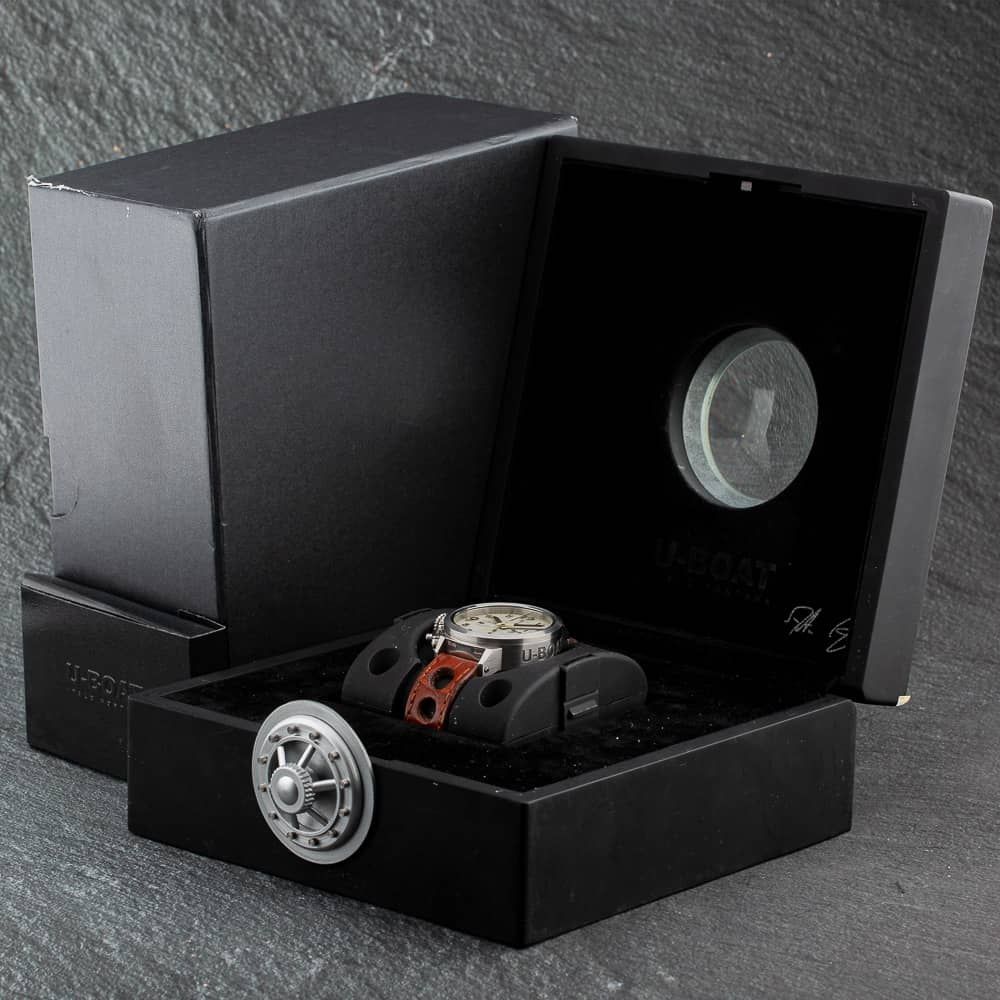 The U-Boat Flightdeck Watch is composed of a 50.0mm round shaped stainless steel case and brown leather strap with a traditional buckle. It has a white analogue dial with a date display, which is protected beneath scratch resistant sapphire crystal glass. Power is generated by the automatic movement. This model is also water resistant up to 100 metres.