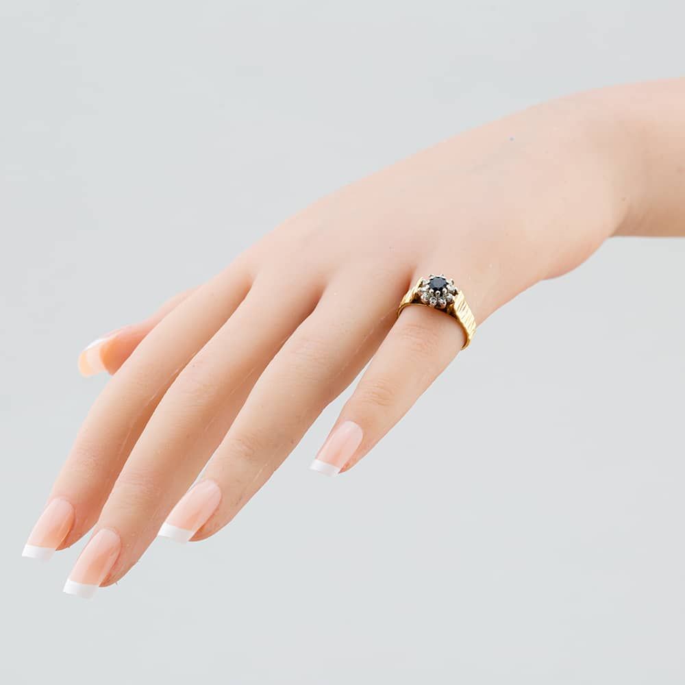 Vintage 18ct Yellow Gold Sapphire & Single Cut Diamond Patterned Shoulders Flower Cluster Ring