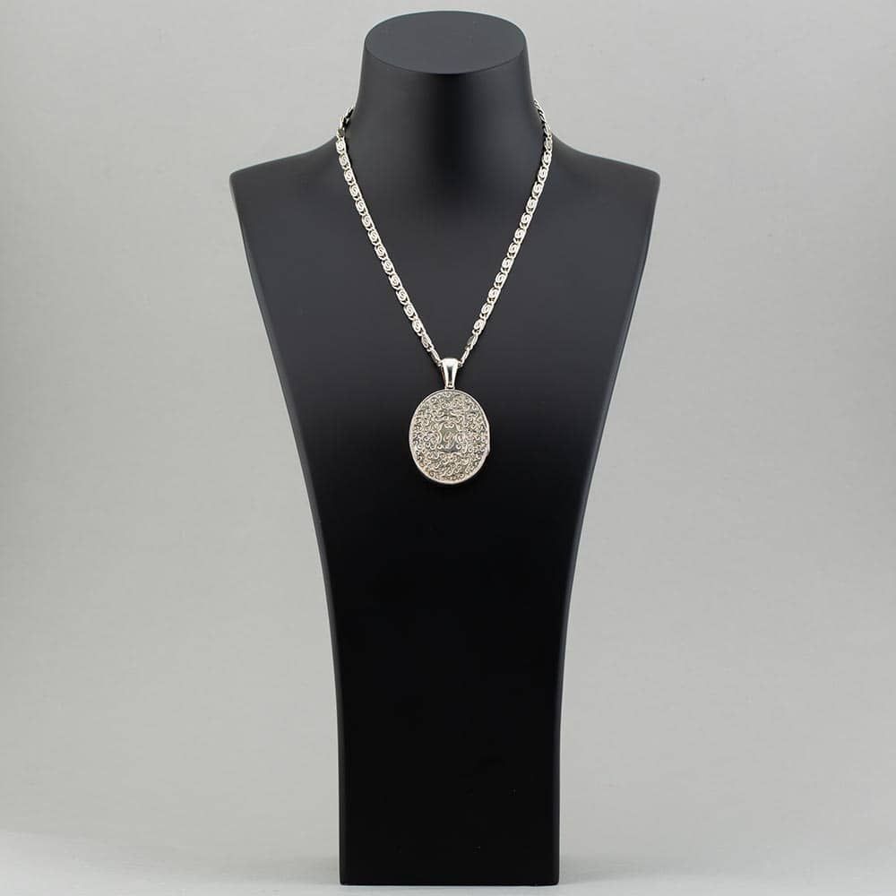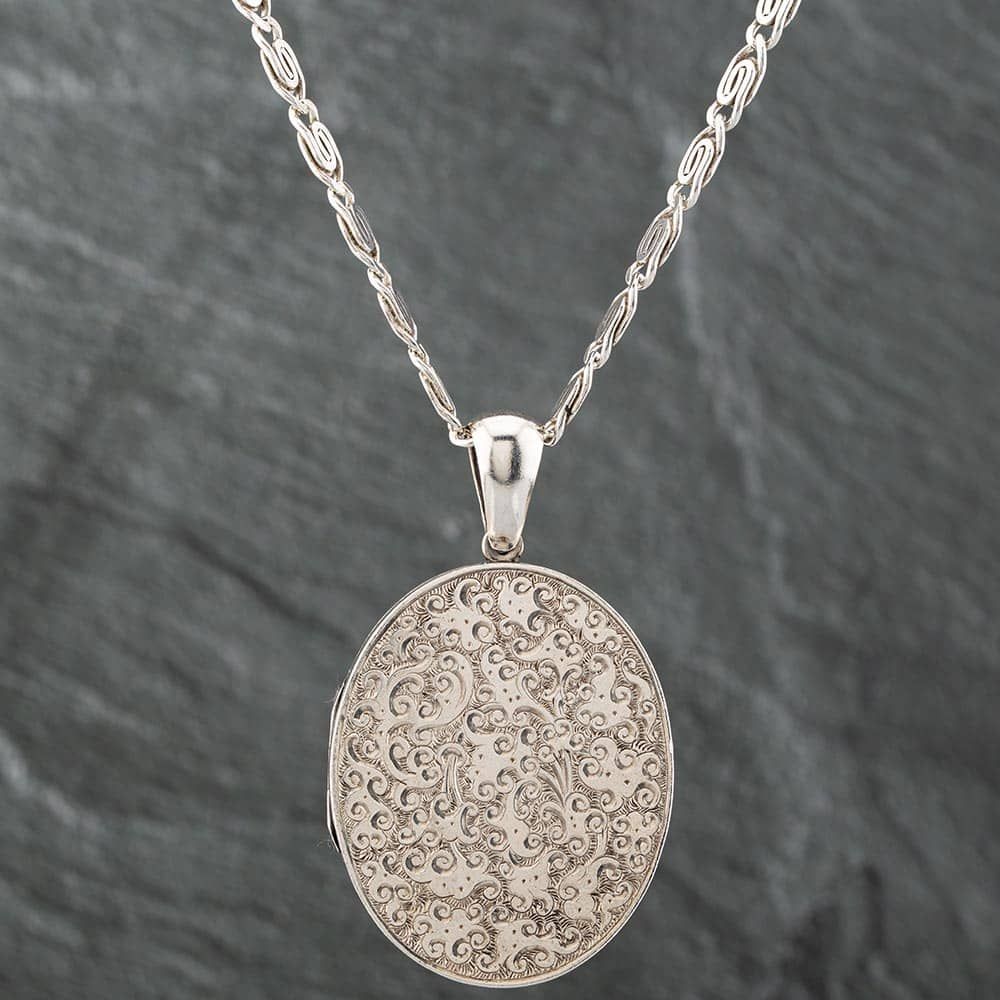 Vintage Silver Large Oval Engraved Locket Pendant & 17 Inch Chain