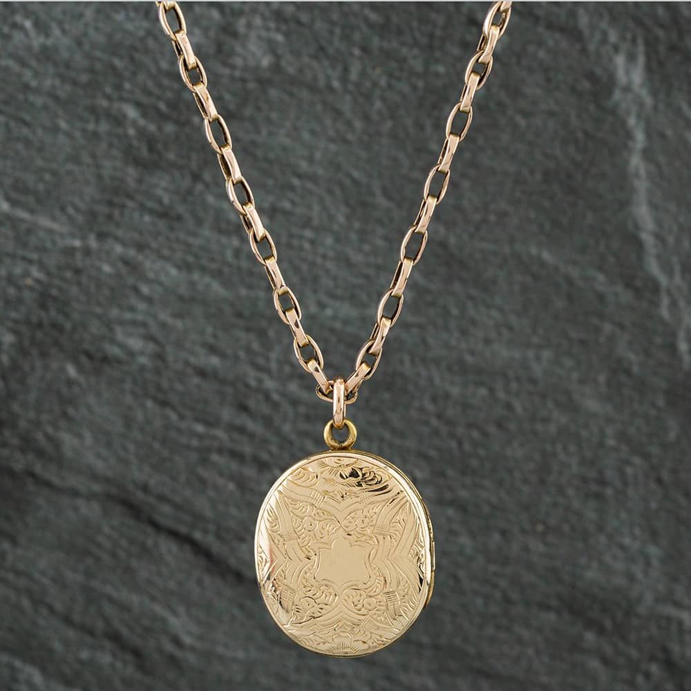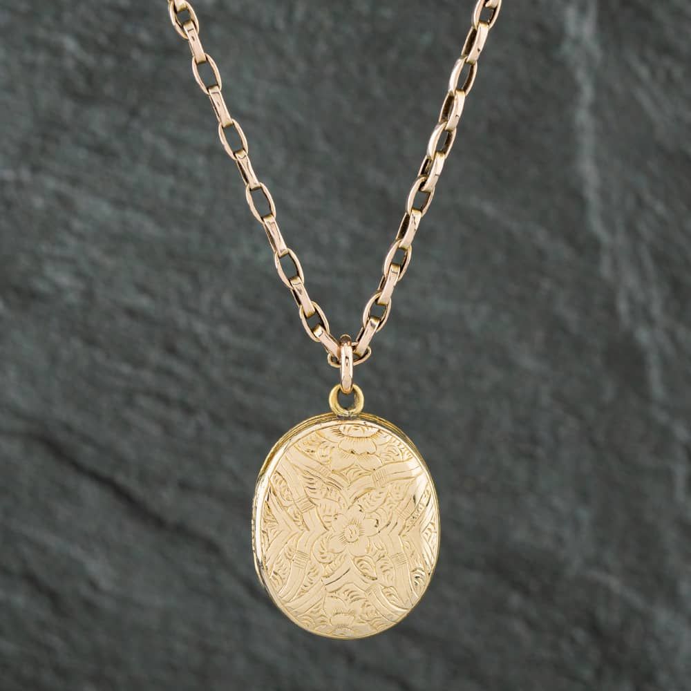 Vintage Yellow Gold Hand Engraved Oval Locket & 22 Inch Belcher Chain