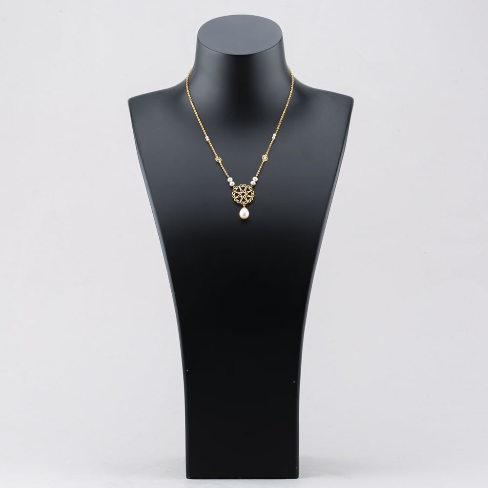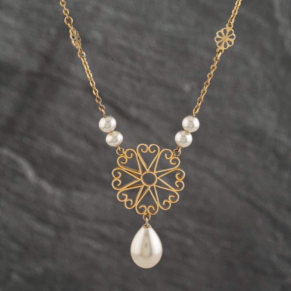 Second Hand Vintage Yellow Gold Pearl Fancy Round Drop Pendant & 15 Inch Trace Chain 41142229