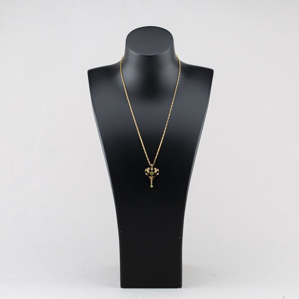 Vintage Yellow Gold Seed Pearl & Peridot Pendant & 19 Inch Paper Link Chain