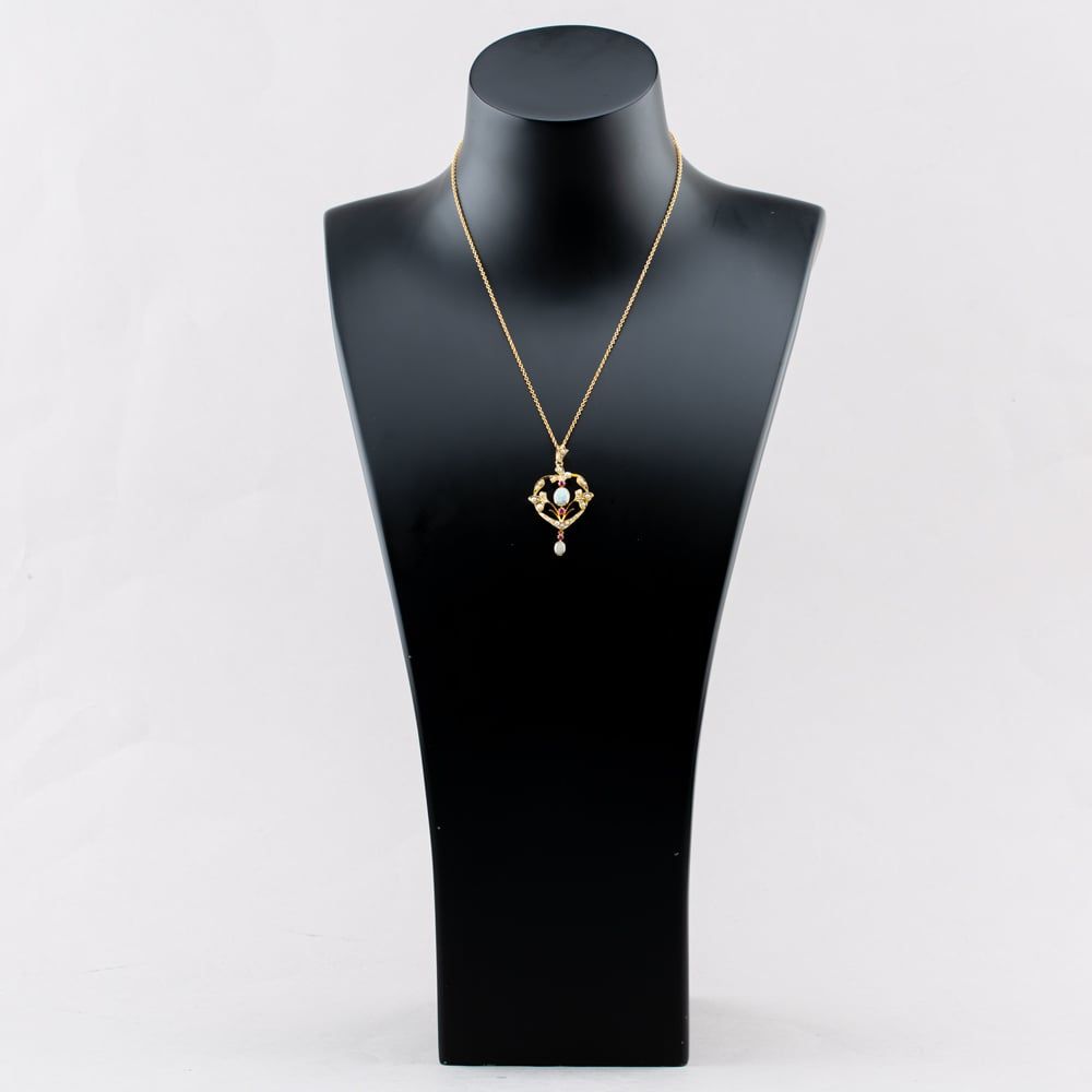 Vintage Yellow Gold Seed Pearl Ruby And Opal Ornate Fleur Di Lis Pendant & 16 Inch Trace Chain