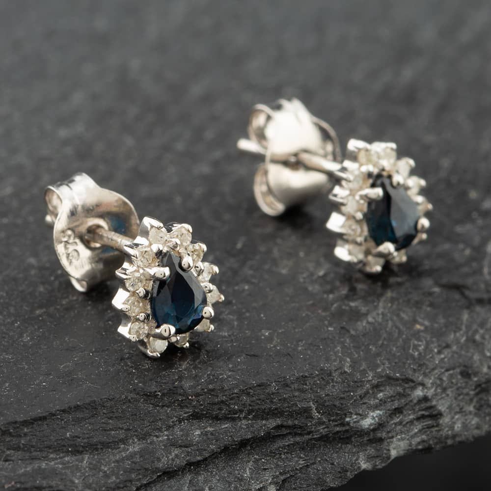 White Gold 0.38ct Pear Cut Sapphire & 0.09ct Brilliant Cut Diamond Cluster Stud Earrings