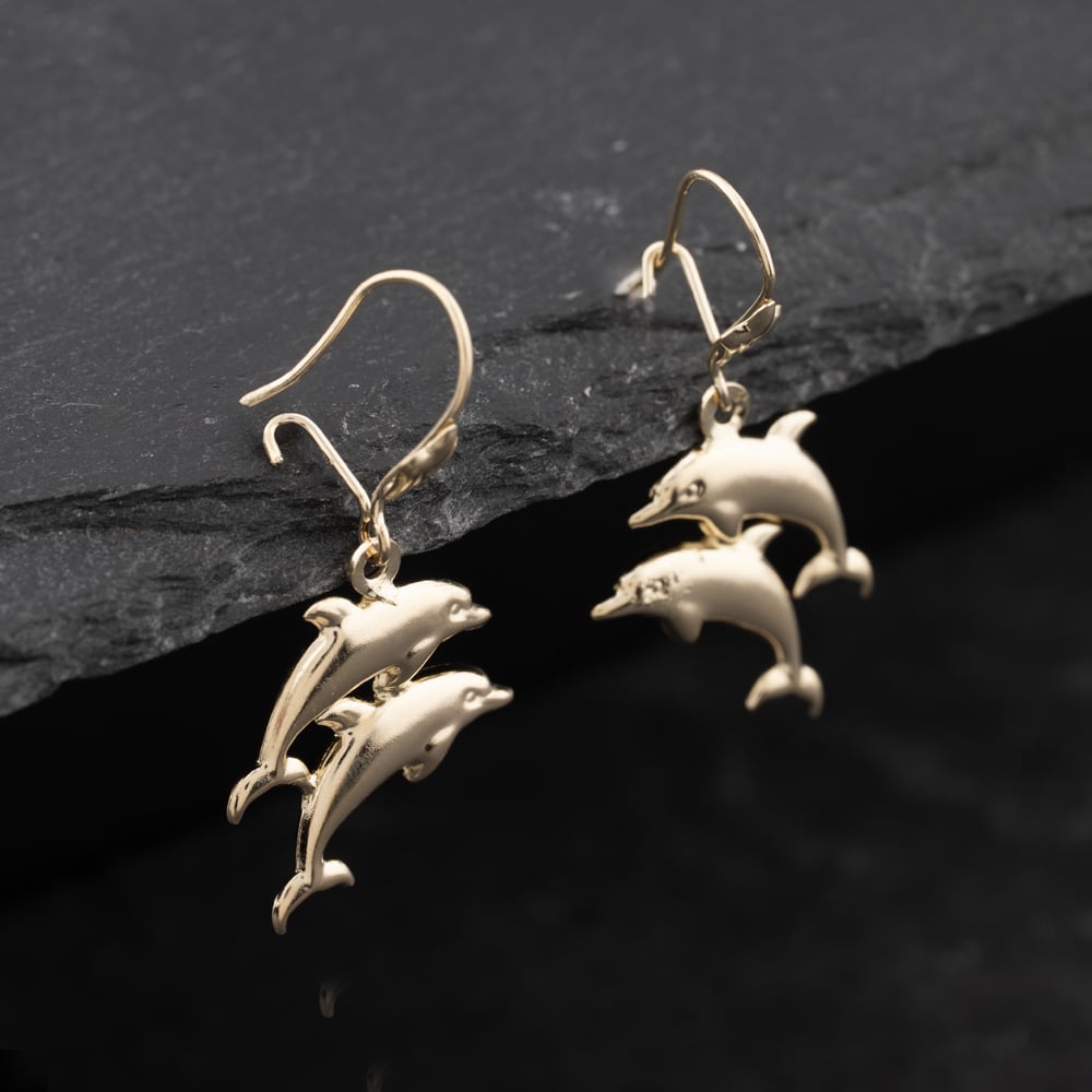 Yellow Gold 30mm Dolphin Dropper Earrings