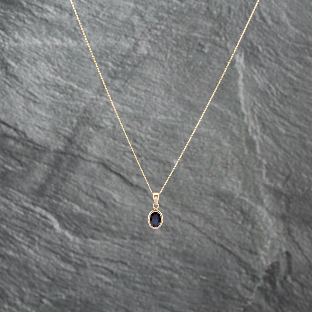 Yellow Gold Sapphire Oval Rubover Set Pendant & 18 Inch Curb Chain