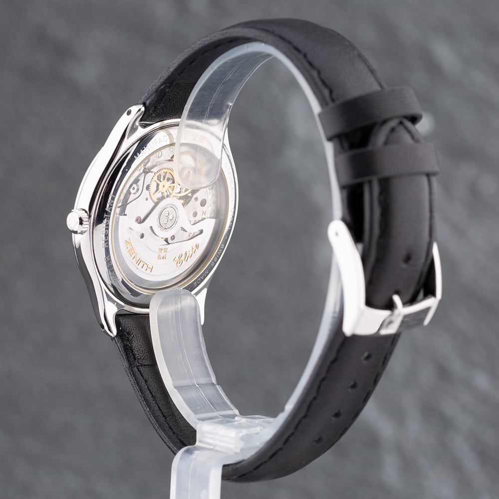 The Zenith Elite Watch combines a round shaped stainless steel case and black leather strap with a traditional buckle. The silver 35.0mm case measures 6.0mm thick and has a silver stainless steel fixed bezel with a sapphire crystal case back and a lug width of 18mm. The black analogue dial is protected beneath scratch resistant sapphire crystal glass and has baton hour markers, as well as a date display. Power is generated by the automatic movement with 27 jewels. The watch weighs 40.5 grams and has a water resistance of up to 30 metres.