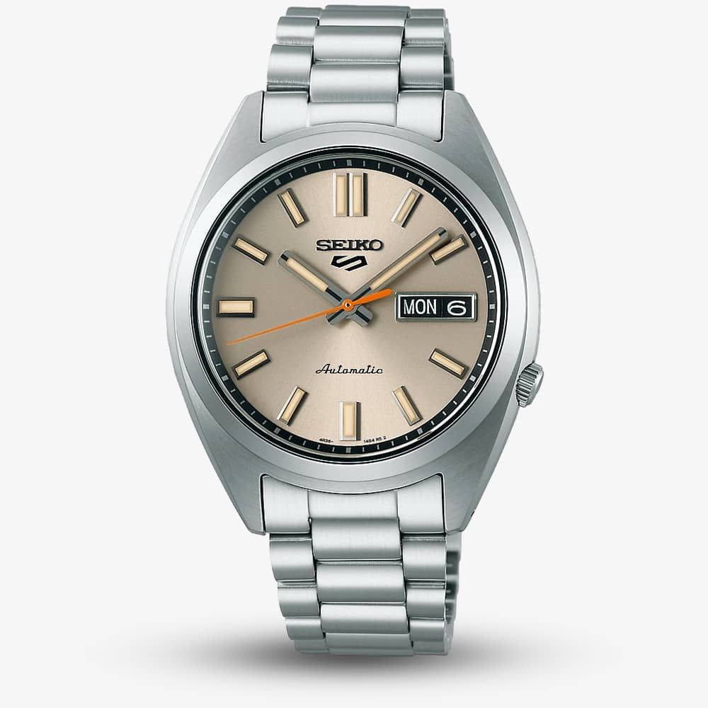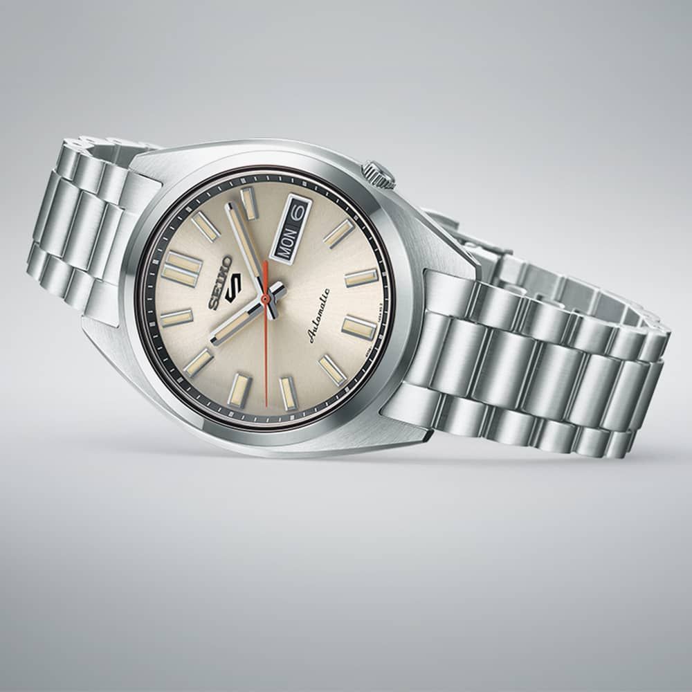 Continuing the evolution of our Seiko 5 Sports SNXS series, this new watch embraces the design principles of the original Seiko 5s, combining vintage charm with modern features. Inspired by 1970s Seiko 5 Sports models, it features Lumibrite hands and indices on a 'beige chinos' cream-colored dial under a semi-spherical glass. The wider, non-triangular hands and orange second hand pay homage to 70s design, powered by the in-house 4R36 automatic movement.