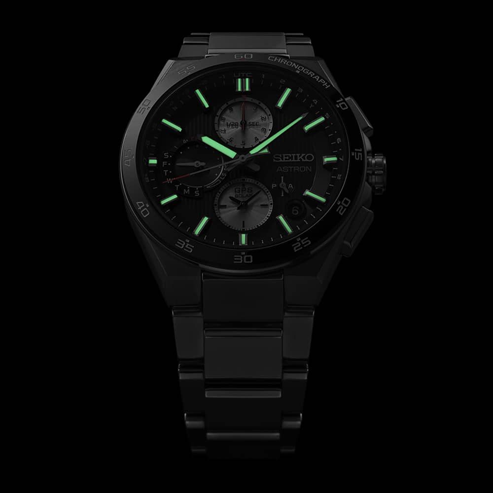 Encased in super-hard coated titanium and protected by dual sapphire glass crystals, this watch features a unique 'night black' dial with a vertical subdual layout, a first for Astron. With a sleek, compact design and a low centre of gravity for comfort, they are powered by the new 5X83 solar-powered movement, offering efficient charging and a one-twentieth of a second chronograph function. This advanced timepiece offers a dual-time function, allowing you to track two time zones simultaneously. With GPS signal reception, it ensures accurate timekeeping worldwide, while the perpetual calendar adjusts for varying month lengths and leap years. The satellite acquisition status display keeps you informed of signal connection. Crafted with a durable titanium case and a ceramic bezel, this watch combines cutting-edge technology with exceptional durability and style.
