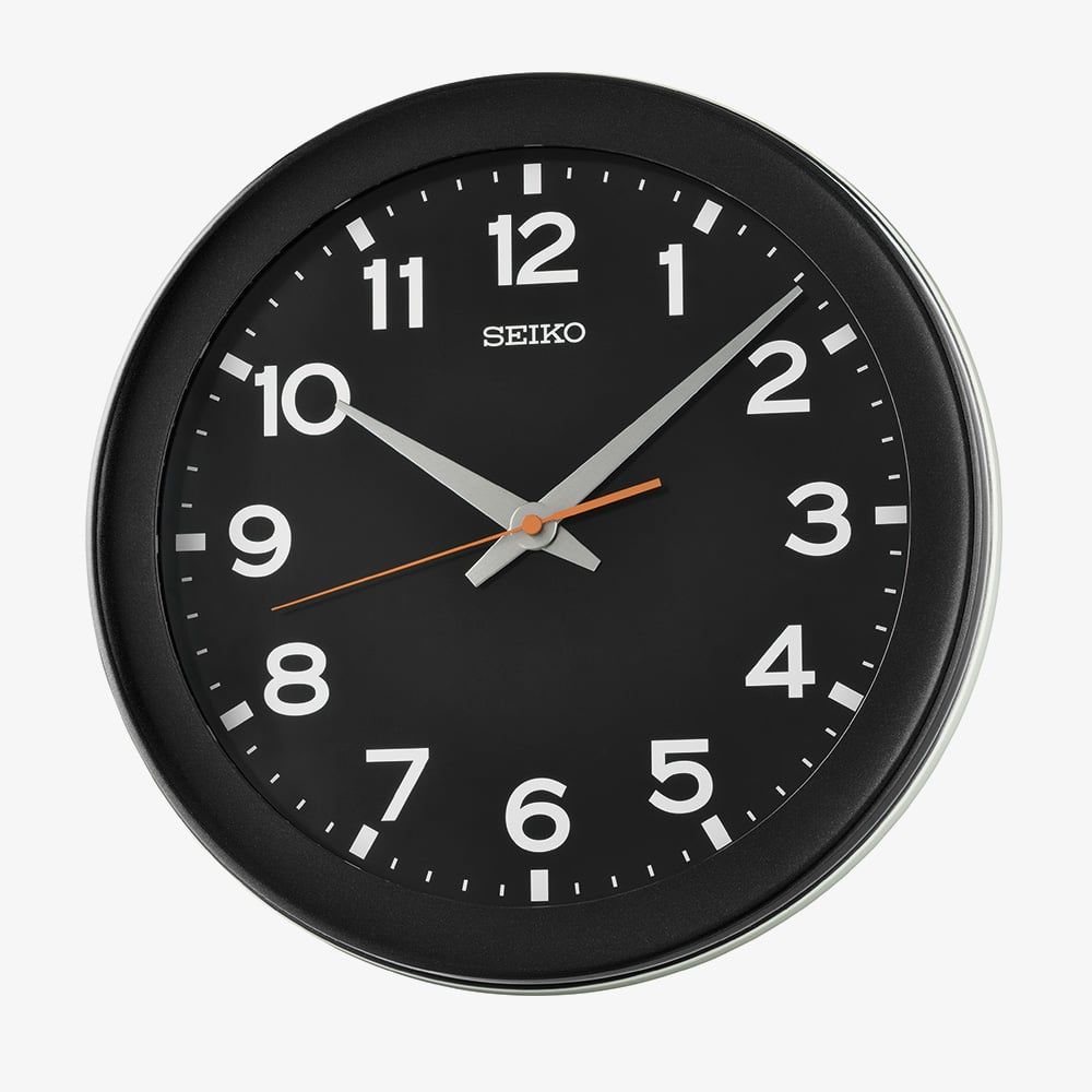 The Seiko Black Round Wall Clock features a black dial with clear white number hour markers, silver hour and minute hands, and a vivid orange quiet sweep seconds hand for easy readability and a modern, stylish look.