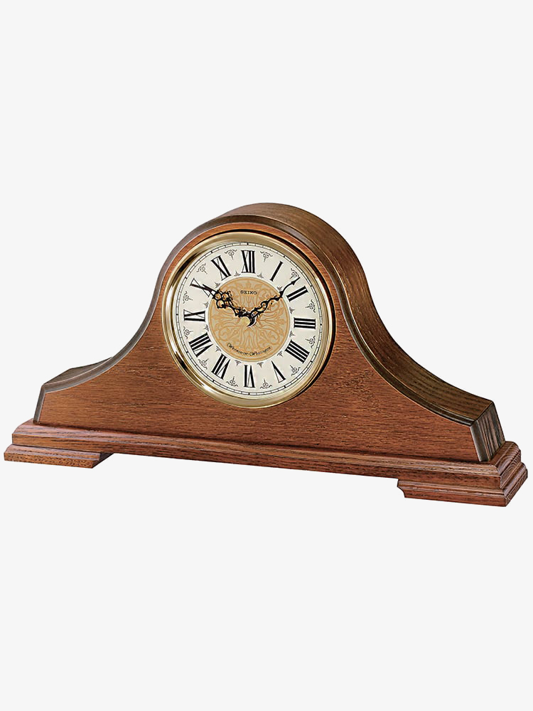 An analogue Seiko mantel clock composed of a brown oak wood case with a two tone white and gold dial. It is powered by a quartz movement and has black decorative hands with Roman numeral hour markers. This model also chimes and has volume controls as well as a mute option which can be kept on permanently or muted just at night time.