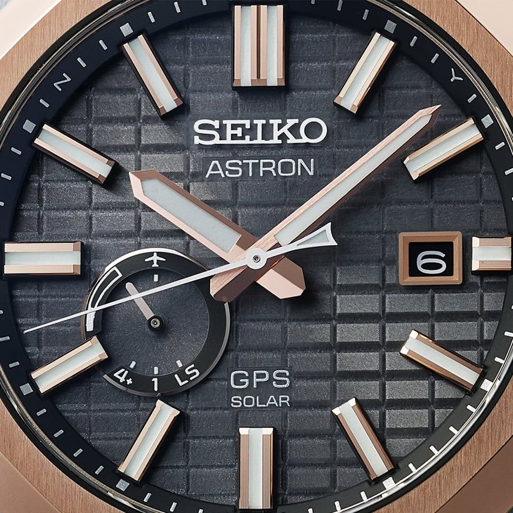 This timepiece features a 'crystal box' pressed dial pattern, inspired by the original Seiko Astron and its connection to quartz crystals, as the world’s first quartz-powered watch launched in 1969. The name also refers to the box-shaped sapphire crystal glass used in several Seiko designs, offering scratch resistance and impressive clarity while sitting slightly above the bezel for enhanced legibility and a vintage geometric aesthetic. A first for the Astron collection, this watch boasts a polygonal rose gold bezel, contributing to its strong, dynamic appearance alongside highly visible indices, showcasing new levels of innovation in its design.