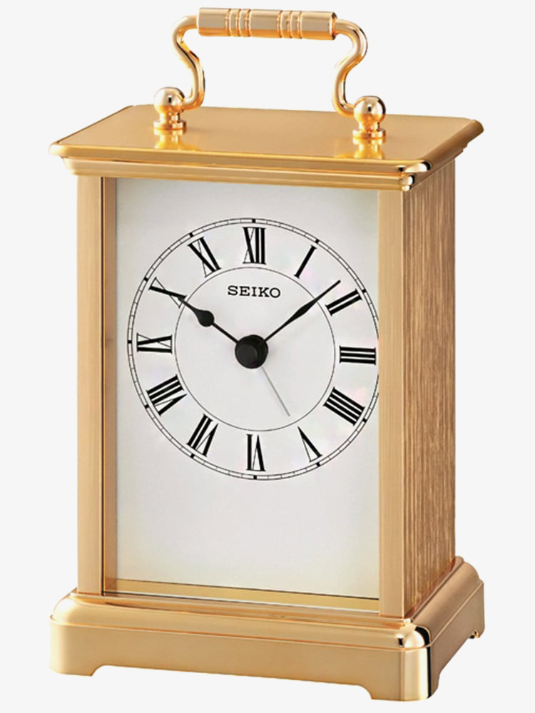 A rectangular shaped analogue Seiko mantel clock composed of a gold metal case with a white dial. It is powered by a quartz movement and has black hands with Roman numeral hour markers.