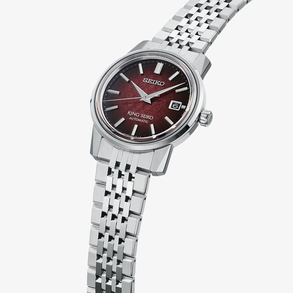 ‘Ukiyo-e’ is a traditional Japanese art form that emerged in the 17th century, featuring woodblock prints or paintings that depict scenes of Japanese culture, such as Kabuki actors, Sumo wrestlers, historic events, folk tales, landscapes, and nature. The dial of this King Seiko timepiece draws inspiration from the natural beauty of Kameido, where the King Seiko brand originated, and is crafted in the style of Ukiyo-e.