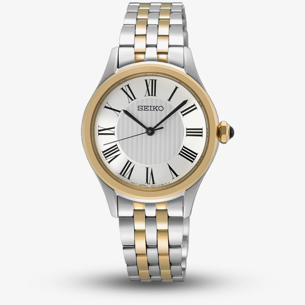 The Seiko Caprice ladies watch exudes classic sophistication with a modern twist. Its elegant two-tone silver and gold stainless steel case and bracelet bring timeless charm, while the crisp white dial is beautifully contrasted by bold black Roman numeral hour markers, sleek black hands, and a matching black crown detail. A refined piece designed to elevate your everyday style.