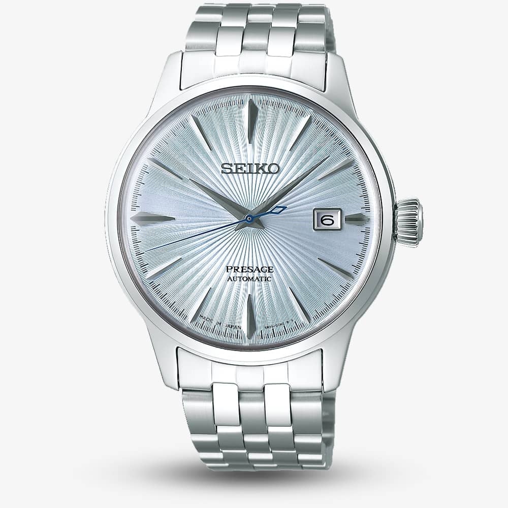 Inspired by Japanese cocktail culture and the Skybar in Tokyo’s elegant Ginza area, this watch reflects the delicate blue hue of the Skydiving cocktail in its dial design. The Seiko Presage collection embodies timeless elegance and precise Japanese mechanical timekeeping, featuring minimalistic designs with a distinct Japanese aesthetic.