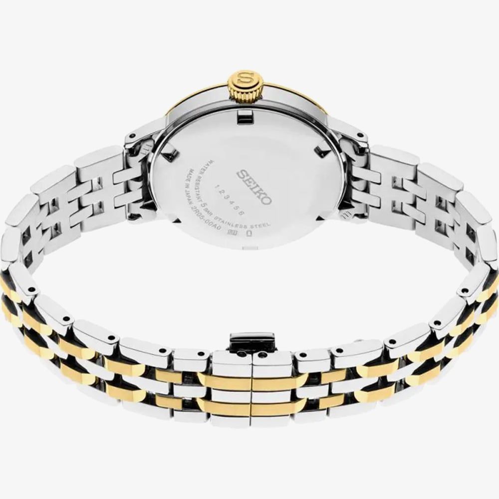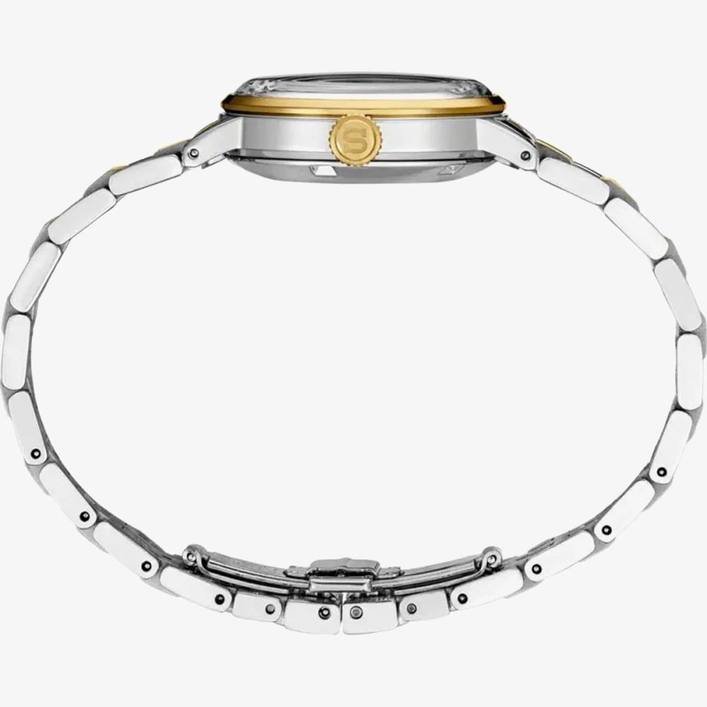 This elegant timepiece from the Seiko Presage Cocktail Time collection is inspired by Japan’s vibrant cocktail culture. Featuring a shimmering gold dial reminiscent of a Frozen Daiquiri, it is adorned with sparkling white diamond hour markers for a touch of luxury. The two-tone bracelet adds refined style, showcasing a perfect blend of Japanese craftsmanship and cocktail-inspired elegance.
