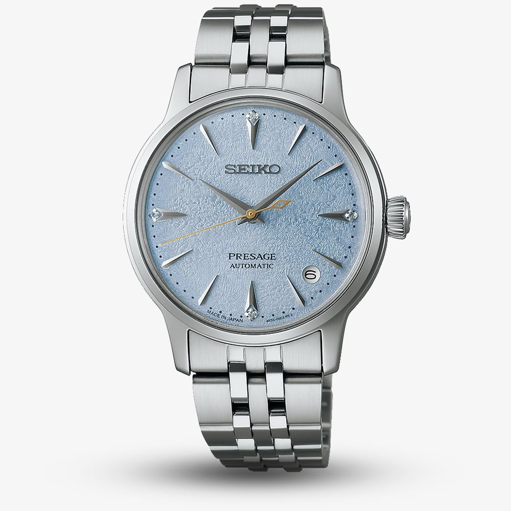 This elegant watch from the Seiko Presage Cocktail Time collection is inspired by Japan’s vibrant cocktail culture. It features a light blue dial reminiscent of the Frozen Skydiving cocktail, accented with shimmering white diamond hour markers. Paired with a polished silver bracelet, it beautifully combines Japanese precision with cocktail-inspired design.