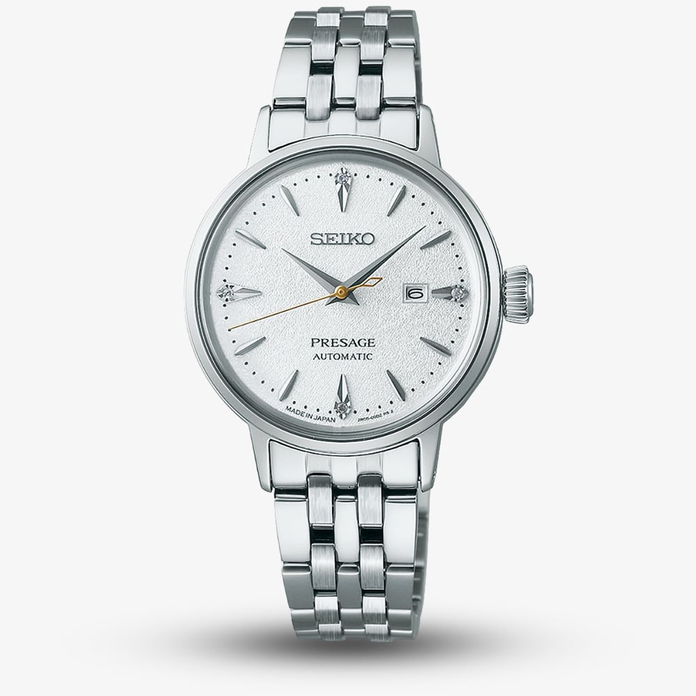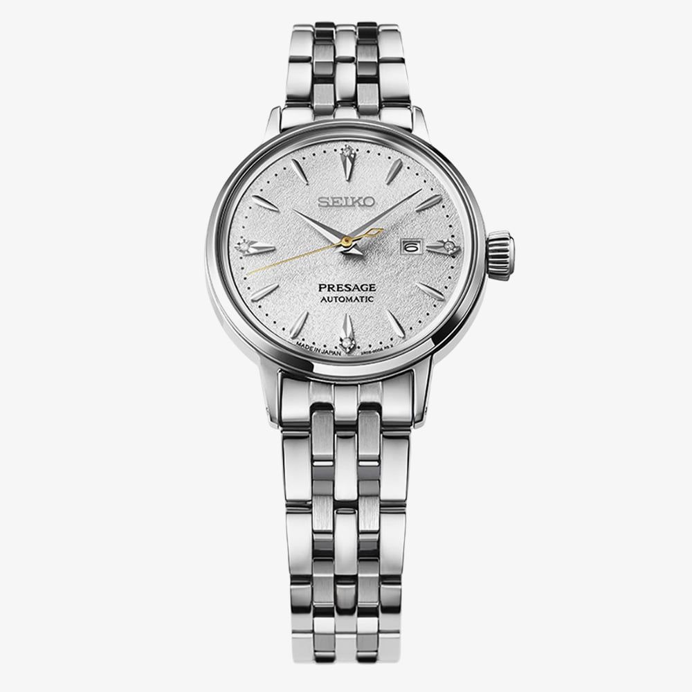 Inspired by the warmth of the Hot Buttered Rum cocktail from Tokyo’s Star Bar, this Seiko Presage Cocktail Time watch blends Japanese elegance with seasonal charm. Part of the "Daytime Cocktail Party" collection, it features a crisp white dial, four diamond-set indices, and a compact 30mm case paired with a refined five-piece bracelet. With its delicate design and precise mechanical movement, it captures the spirit of a cosy Autumn/Winter cocktail, sophisticated, comforting, and distinctly Japanese.