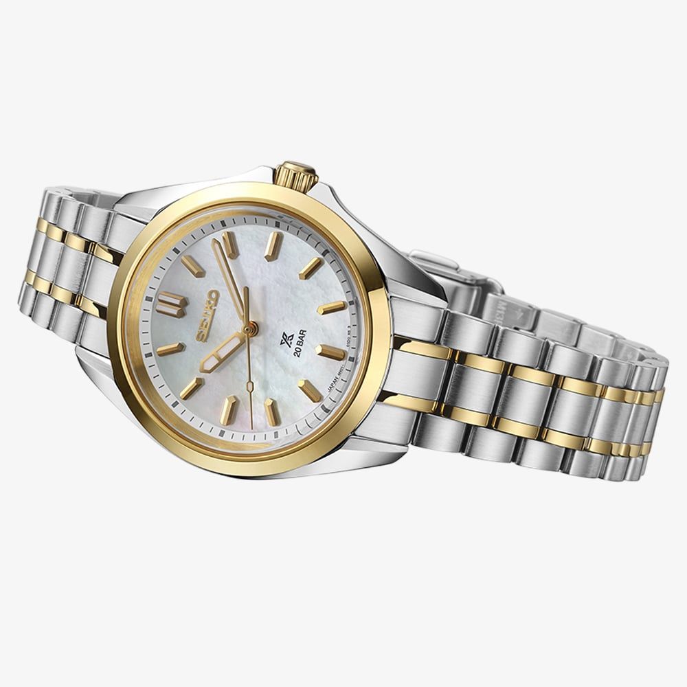 A perfect balance of elegance and sporty functionality. Featuring a polished gold stainless steel case, this sophisticated timepiece offers a timeless look that suits both casual outings and formal occasions. The classic mother-of-pearl dial is enhanced with luminous hands and hour markers for excellent visibility in any environment. while the durable stainless steel bracelet, highlighted with gold-tone details, provides a secure and stylish fit. With an impressive water resistance of up to 200m, this watch is both fashionable and functional.